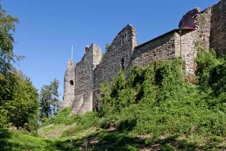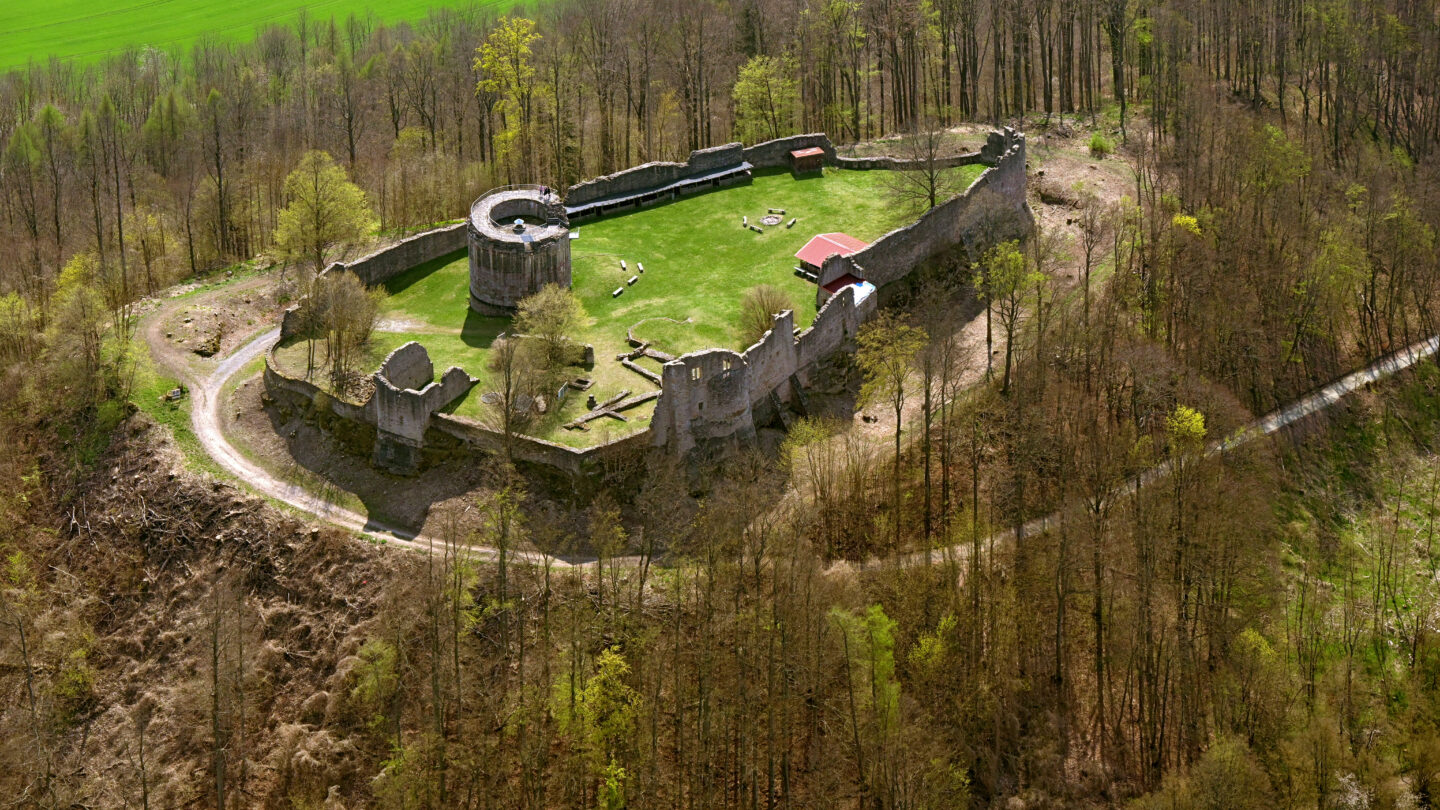 „Ein Herr von edlem Geschlecht zog um in Deutschland, suchte Frieden und eine bequeme Stätte, zu bauen; da kam er nach Franken an einen Ort und fand einen Berg im Land, der ihm gefiel. Als er nun hinritt, ihn zu beschauen, flog vor ihm auf eine Birkhenne, die hatte Junge; die nahm er sich zum Wappen und nannte den Berg Hennenberg und baute ein schön Schloß drauf, wie das noch vor Augen ist.“ Glaubt man der Sage, dann kamen die Grafen von Henneberg auf diese Weise zu ihrem Stammsitz im fränkischen Grabfeld. Womöglich gab aber auch einfach die strategisch günstige Lage den Ausschlag. Denn der Henneberg erhebt sich als freistehender Berg rund 130 Meter über das Umland. Ganz in der Nähe verlief im Mittelalter die wichtige Handelsstraße von Würzburg nach Meiningen. Auf den ersten Blick mag die heutige Burgruine Henneberg wie eine Ruine von vielen erscheinen. Doch sie war namensgebender Stammsitz eines einstmals in Thüringen herrschenden Adelsgeschlechts.