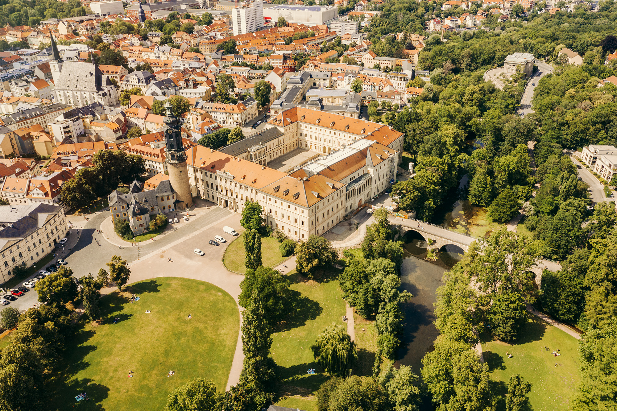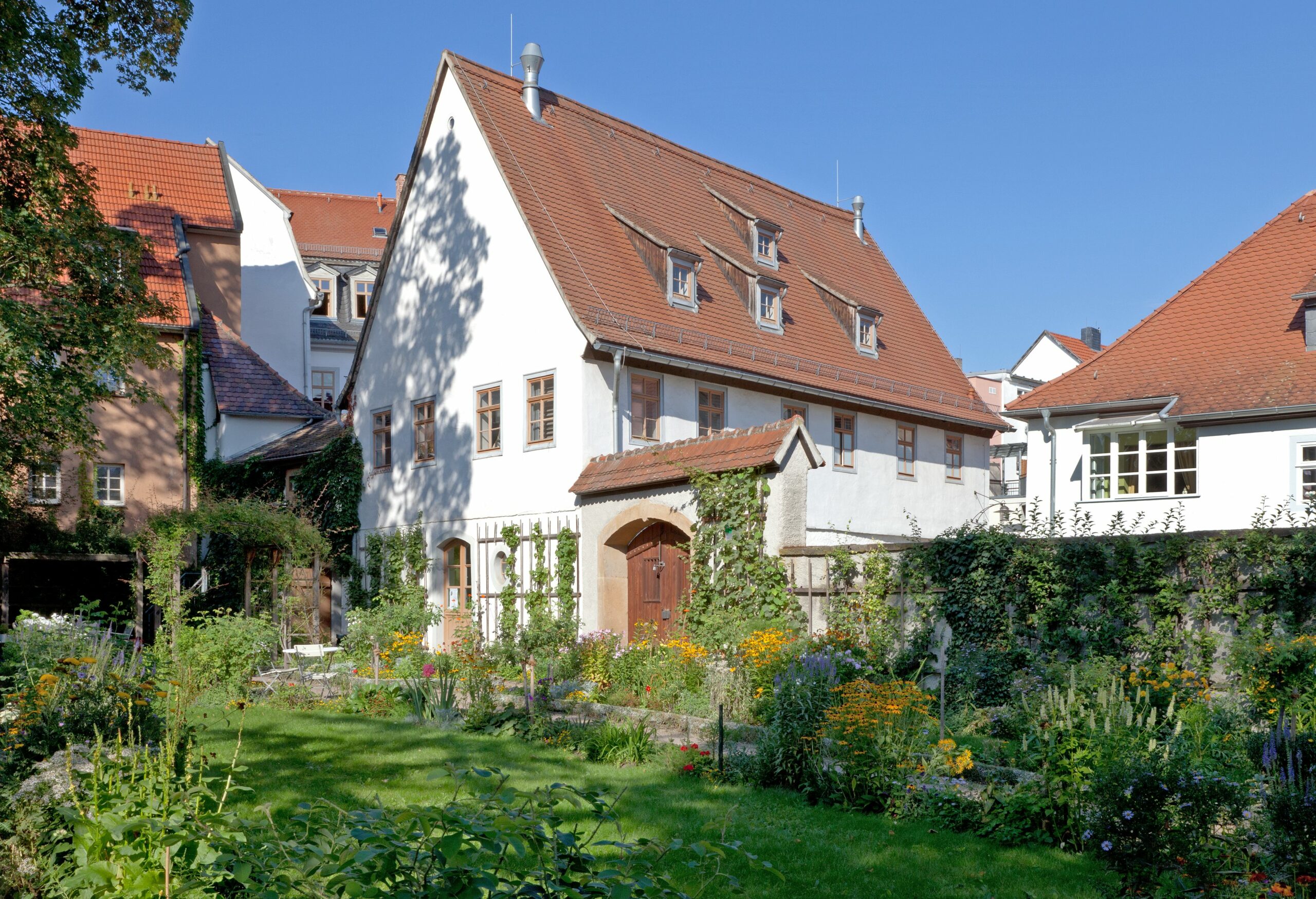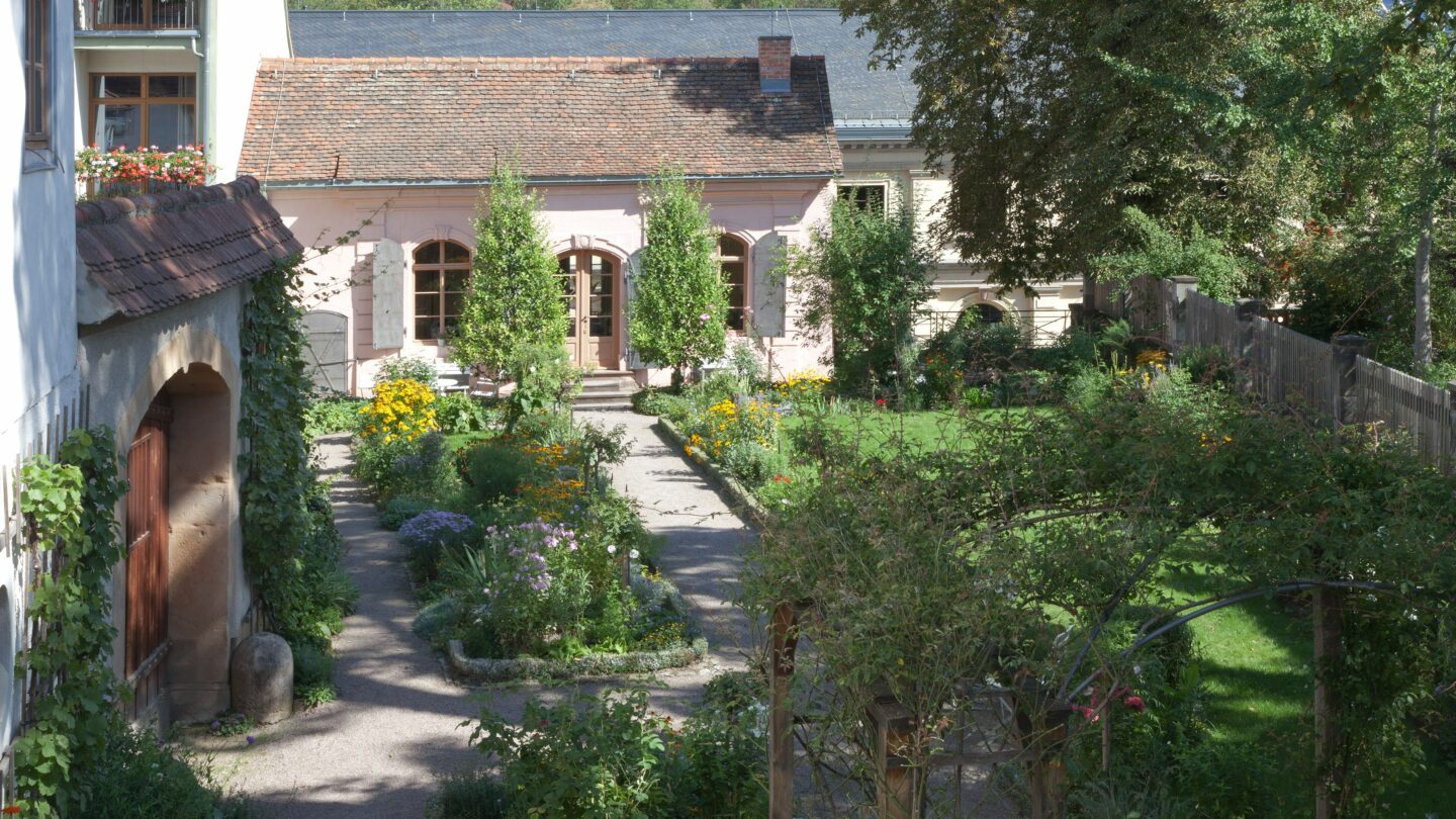 Es ist eines der ältesten Häuser Weimars, war ab 1701 das Zuhause der Familie Kirms und ein wichtiger Treffpunkt für Künstler, Musiker und Gelehrte. Berühmte Persönlichkeiten wie Franz Liszt, Johann Nepomuk Hummel oder Hans Christian Andersen waren regelmäßig an der Jakobstraße zu Gast. Wer das Kirms-Krackow-Haus heute besucht, taucht ein in die Wohnkultur des gehobenen Bürgertums der Goethezeit – und darf obendrein einen intimen Blick in das Familienleben der Kirms werfen. Ein Kleinod mitten in der Weimarer Altstadt ist zudem der bürgerliche Blumengarten.