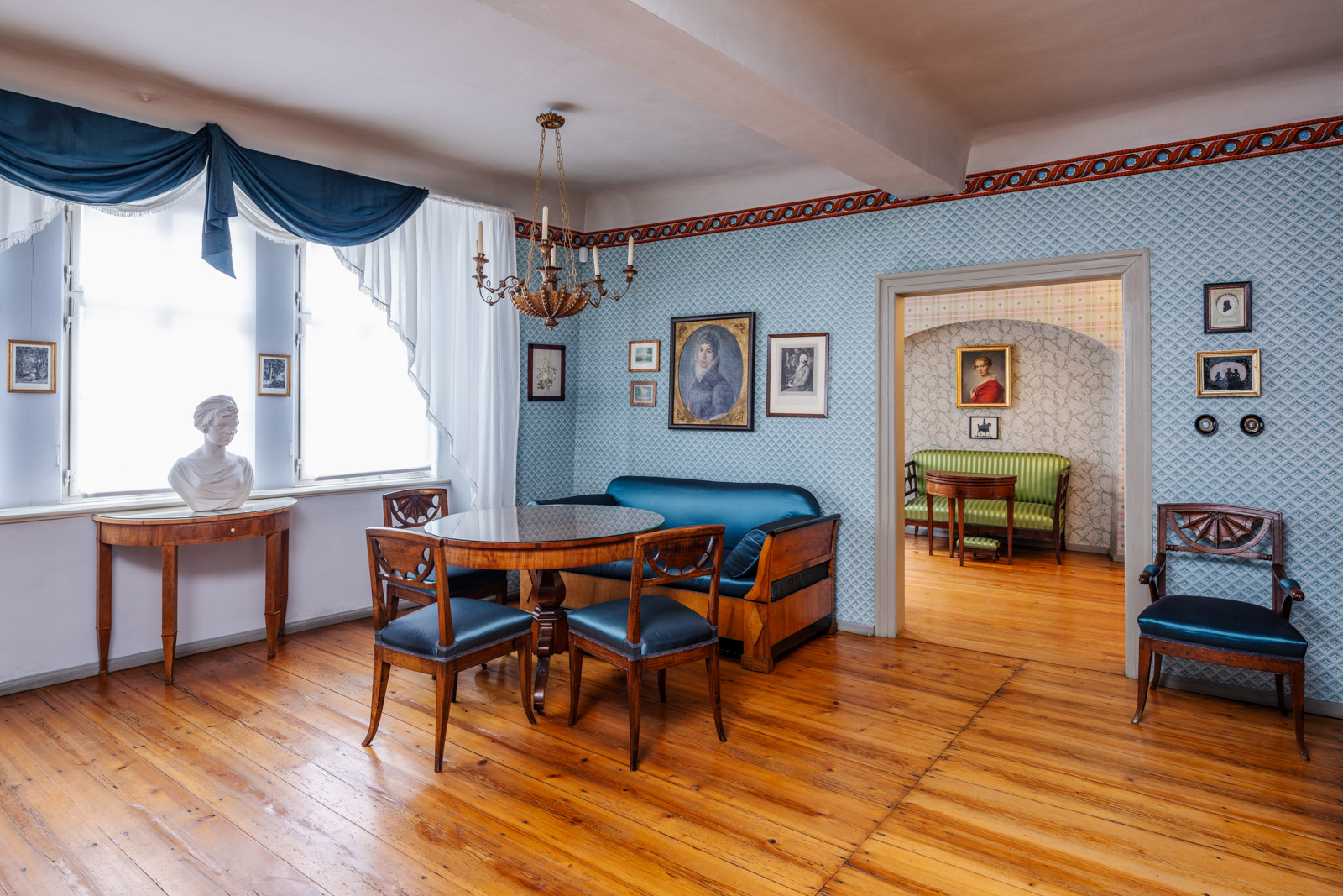 Einen Steinwurf von der Herderkirche entfernt öffnet sich hinter einer schlichten Fassade ein lichter Innenhof, an den sich einer der reizvollsten Stadtgärten Weimars anschließt. Das Ensemble gehörte in der Goethezeit zu den bedeutenden Treffpunkten der Weimarer Gesellschaft. Die Brüder Franz und Carl Kirms standen in herzoglichen Diensten und pflegten rege Beziehungen zum Hof und zu Künstlern, Wissenschaftlern und Stadtbürgern. Schon im Lauf des 19. Jahrhunderts wurde das Haus als privater Erinnerungsort an diese Glanzzeit kaum verändert. Der umfangreiche Originalbestand sorgt für eine einzigartige Atmosphäre. Seit 1917 Museum, ist das Kirms-Krackow-Haus heute beliebter Geheimtipp für Flaneure und Kulturgenießer sowie begehrter Veranstaltungsort.