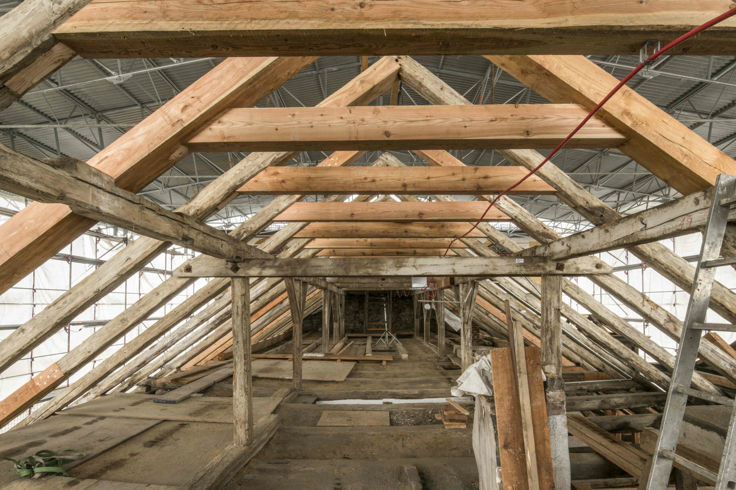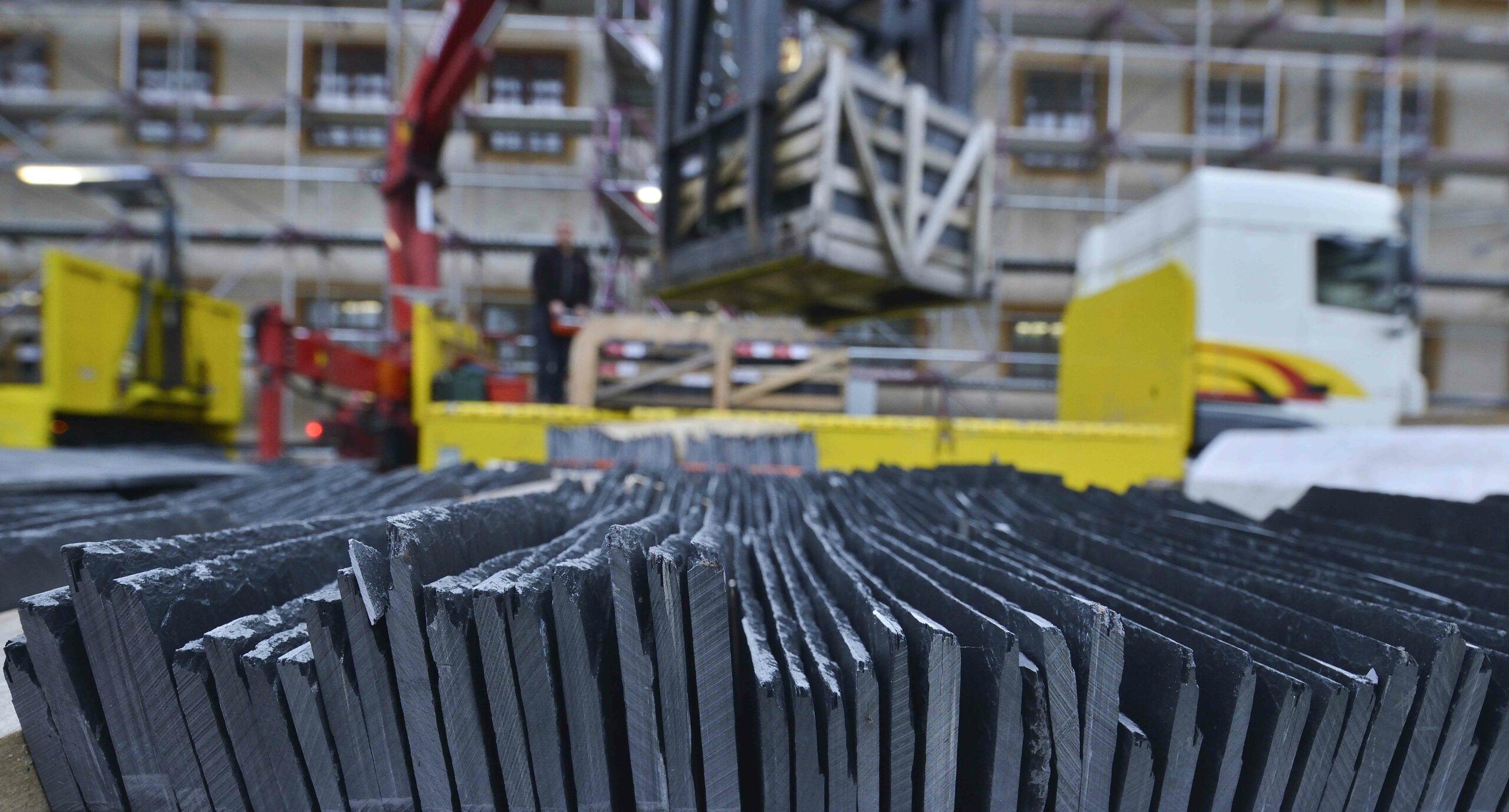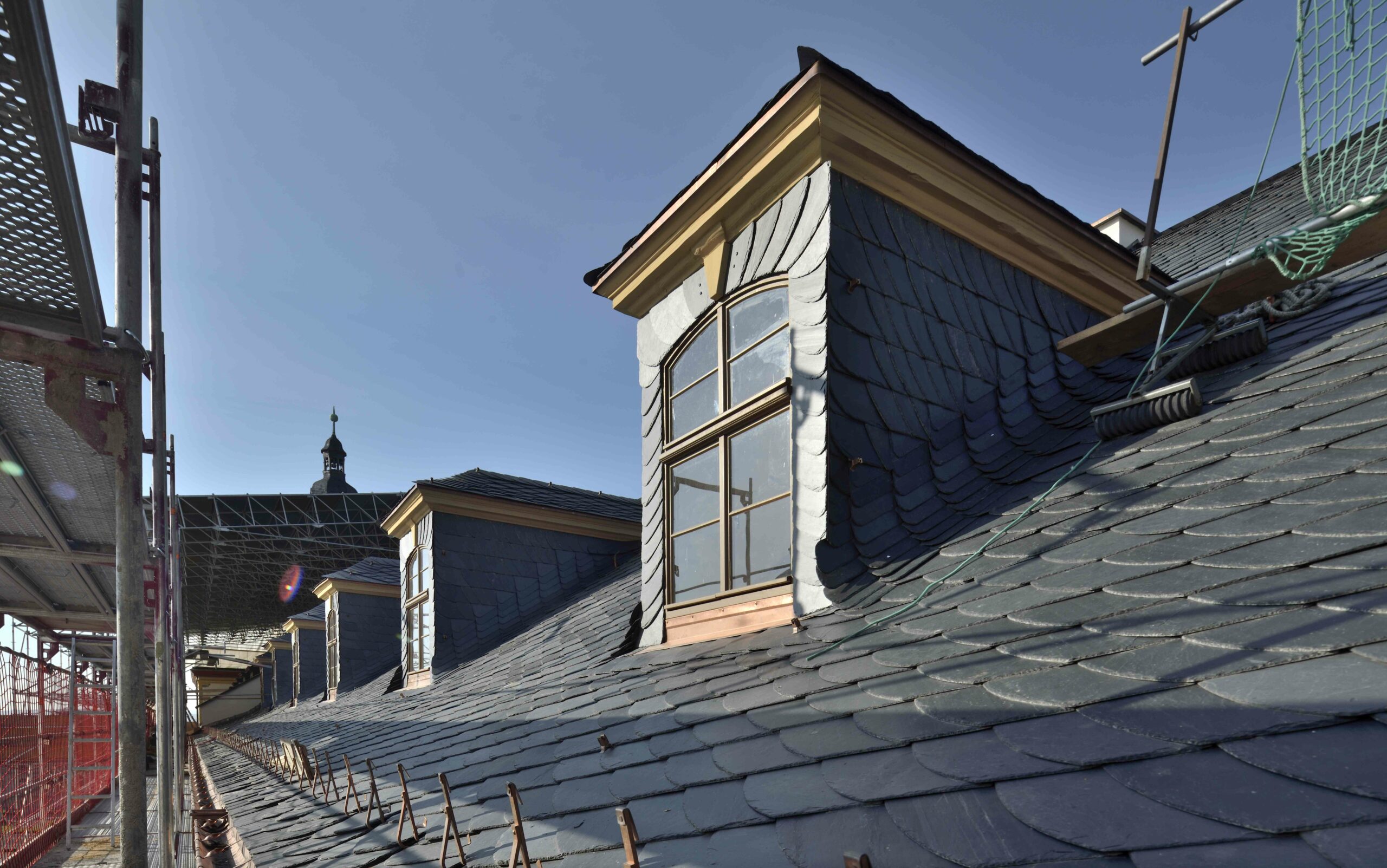 2100 Quadratmeter Dach wurden im Zuge der Sanierung verschalt und mit Schiefertafeln neu gedeckt. Ungefähr 65 Tonnen Schiefer waren dafür nötig. Für die Entwässerung sorgen 200 Meter Dachrinne und 175 Meter Fallrohr.