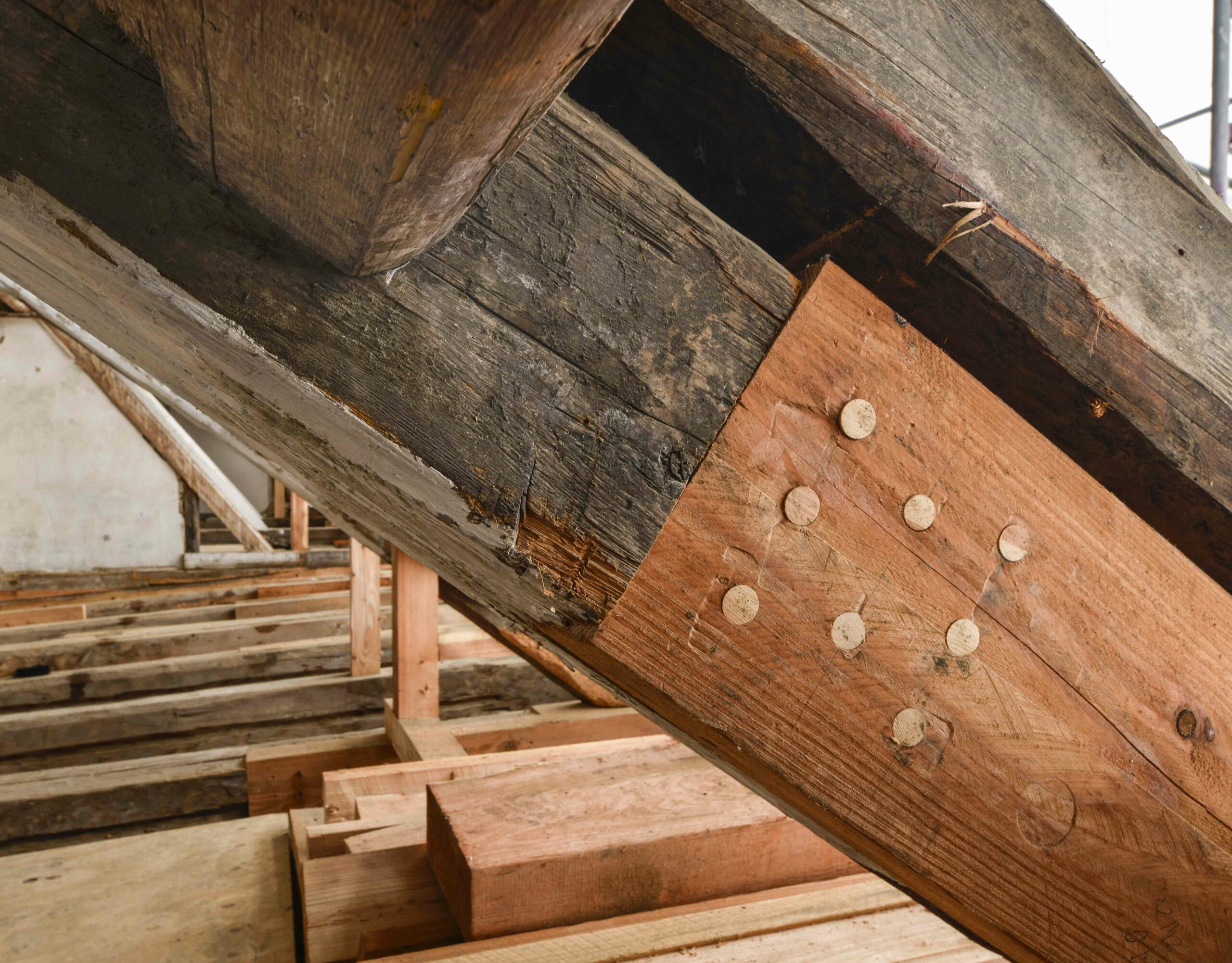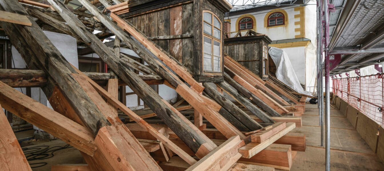 Mit der Dachsanierung am Westflügel konnte 2021 eine wichtige Etappe im Rahmen der umfangreichen Sanierungsmaßnahmen an Schloss Friedenstein in Gotha abgeschlossen werden. Sparren für Sparren arbeiteten sich die Zimmerleute von Norden nach Süden durch die Dachkonstruktion. Auch in die Deckenkonstruktion über dem zweiten Obergeschoss mussten sie immer wieder eingreifen. Marode Teile wurden erneuert, intakte historische Substanz blieb erhalten und wurde stabilisiert. 127 Kubikmeter Holz wurden dabei verbaut. Das sind etwa zwei Kilometer Dachbalken. Auch die 22 Dachgaupen kamen in die Kur.