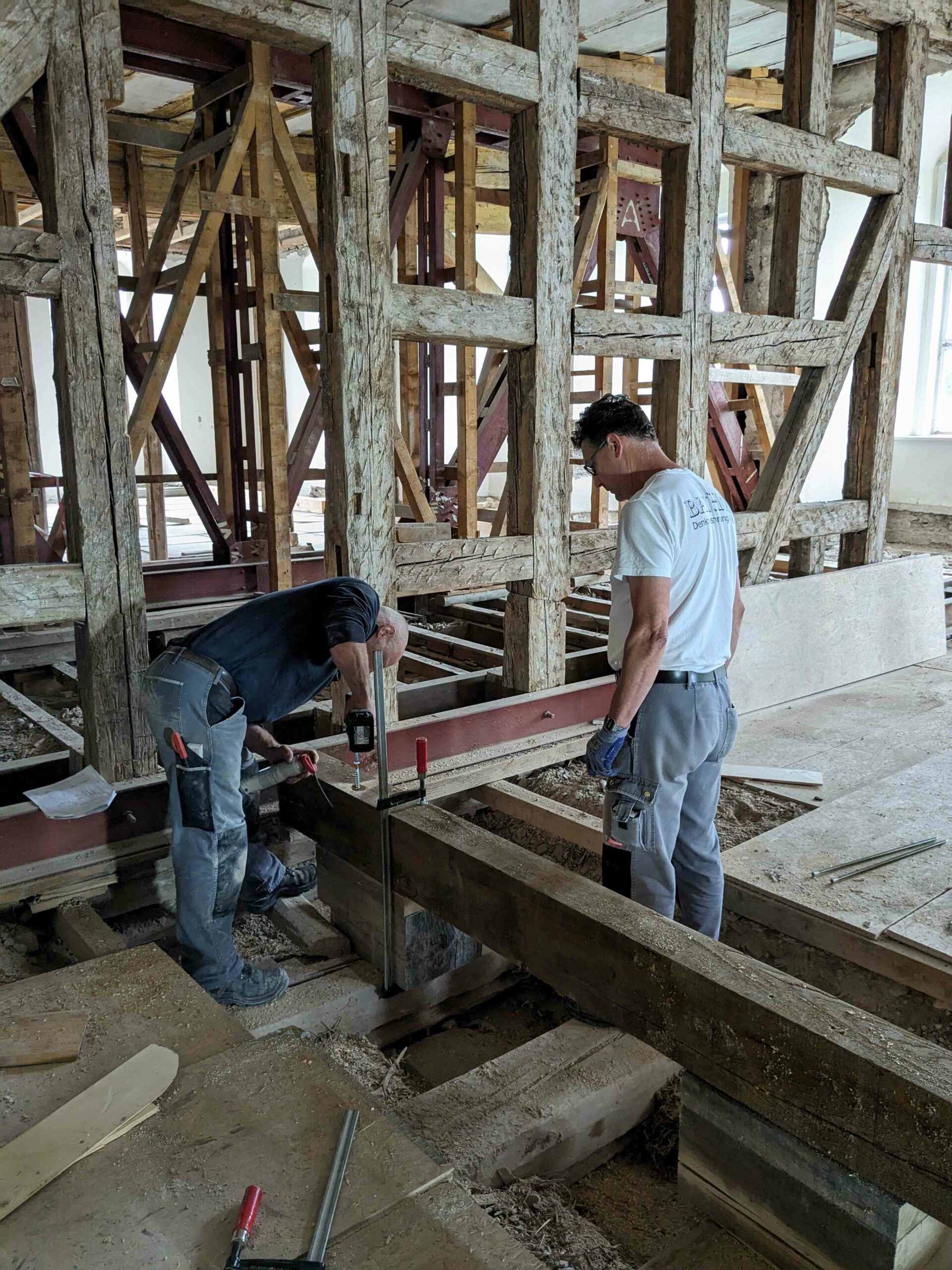 Durch Rückbauarbeiten in Westflügel und Westturm wurden wichtige Voraussetzungen für die Sanierung geschaffen. Gezielt mussten im ersten und zweiten Obergeschoss schadhafte Konstruktionen wie etwa Balkenauflager, Stützen und überlastete Decken freigelegt werden. So war es Vermessern und Statikern möglich, die Schäden der Baukonsrtuktion genau zu analysieren. Die Ergenisse der Untersuchungen fließen in die Sanierungsplanung ein.