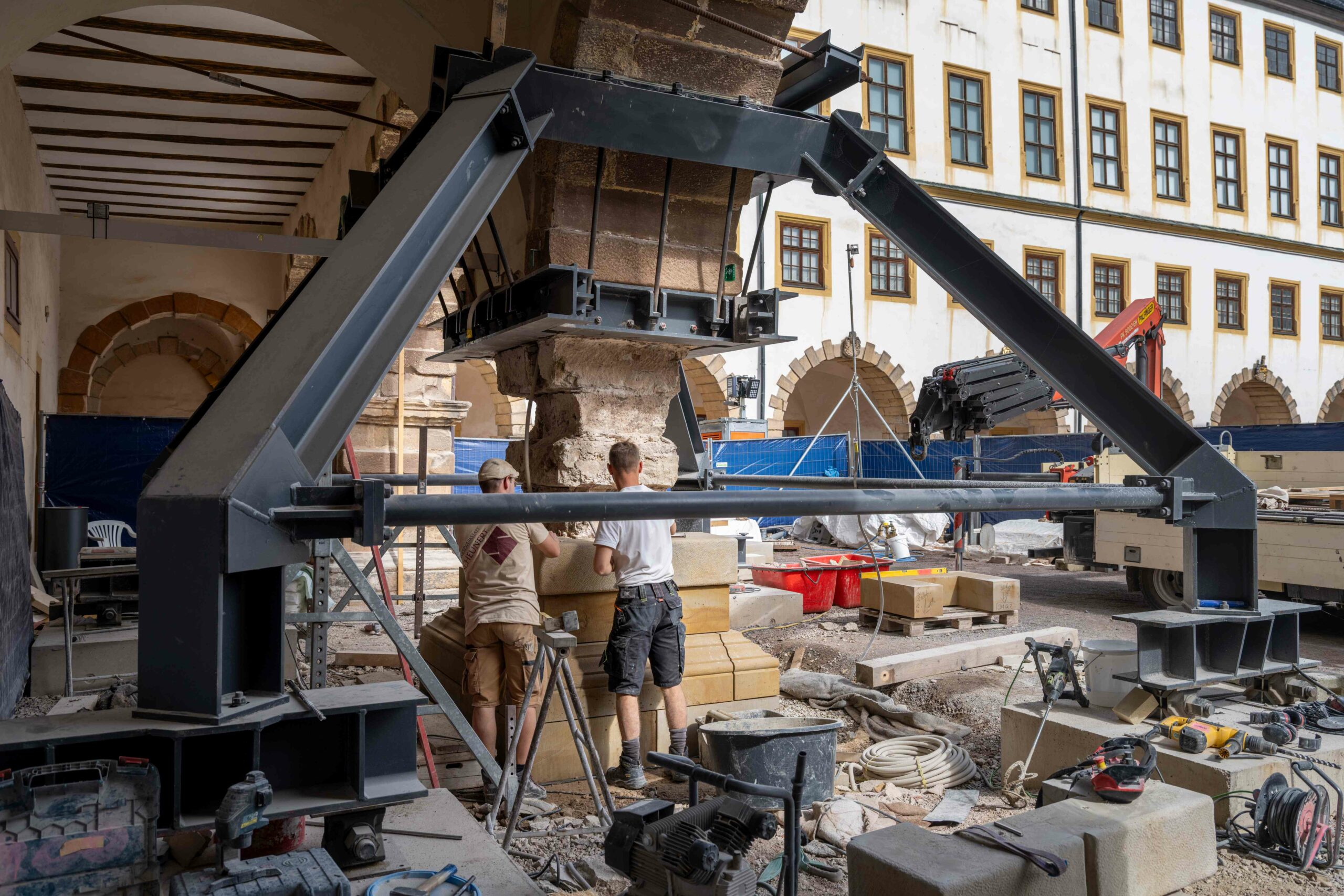 Im Hof von Schloss Friedenstein wurde 2025 die Sanierung eines Arkadenpfeilers erprobt. Die Pfeilersanierung dient als Muster für die Sanierung aller Arkadenpfeiler am Westflügel und weiterer Pfeiler am Ostflügel. Eine komplexe Aufgabe, da jeder Pfeiler rund 270 Tonnen Last aus den Obergeschossen trägt und fest in das statische Gesamtgefüge des Barockschlosses eingebunden ist. Bei der Sanierung kommt deshalb eine speziell angefertigte mehrarmige Stahlkonstruktion zum Einsatz.
