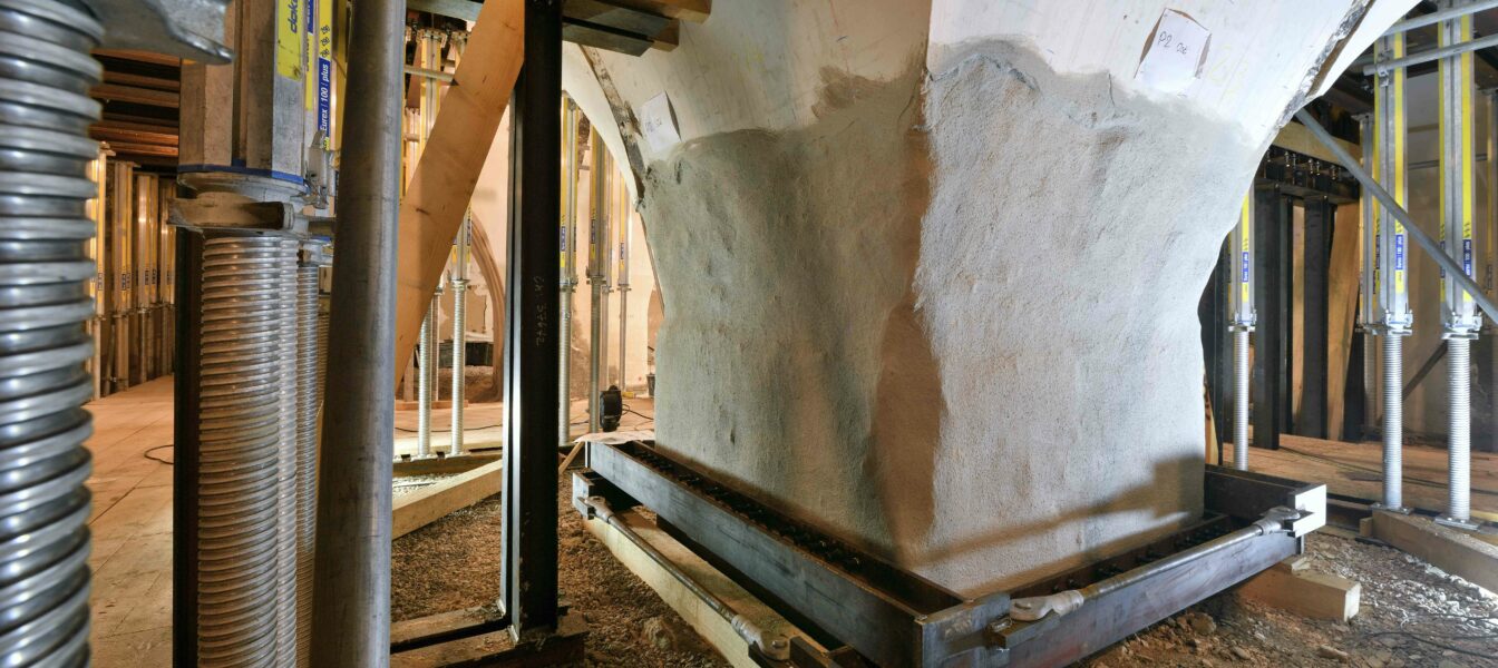 Im Rahmen von Zustandsuntersuchungen für die Sanierungsplanung hatten Statiker 2020 festgestellt, dass der Ostturm nicht standsicher war. Überlastete Pfeiler und Bögen im Keller und im Erdgeschoss drohten den Dienst zu versagen. Notsicherungen waren notwendig, um die Standsicherheit zu gewährleisten. Im Fokus standen drei freistehende Pfeiler und drei Wandpfeiler aus Naturstein. Sie erhielten Stahlumgurtungen, die zusätzlich mit Beton ummantelt wurden. So konnten die gewaltigen Lasten wieder zuverlässig in die Fundamente abgeleitet werden. Um die Wandpfeiler vollständig umfangen zu können, musste die südliche Kellerwand von außen freigelegt werden. Mehr zu den Sicherungsmaßnahmen im friedensteinblog.