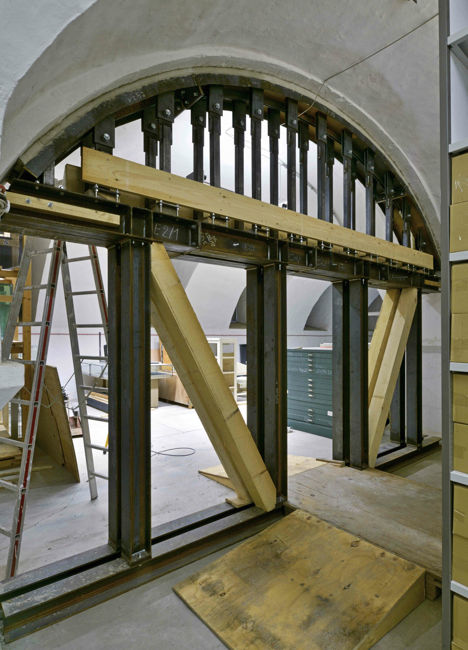 Notgesicherter Pfeiler im Keller des Ostturms von Schloss Friedenstein in Gotha, Foto: STSG, Lutz EbhardtTemoräre Sicherung bis zur Sanierung im Keller des Ostturms von Schloss Friedenstein in Gotha, Foto: STSG, Lutz Ebhardt